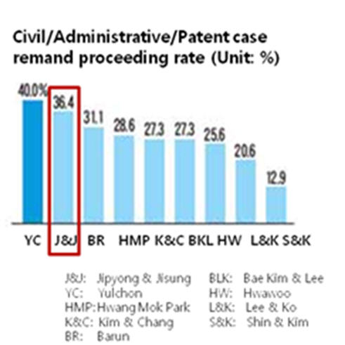 According to following article, Jipyong & Jisung, who is in a strategic partnership with HANYANG International Patent & Law Firm ranked no. 1 including criminal cases in Supreme Court remand proceeding rate (reversing judgments of lower courts (High Court, Patent Court)) and ranked no. 2 in Supreme Court remand proceeding rate in civil, administrative, and patent cases.
